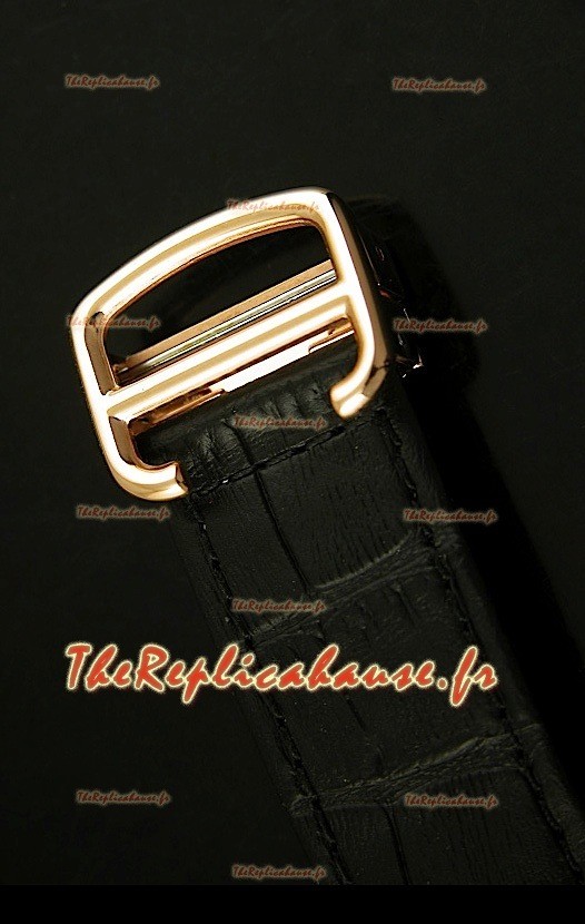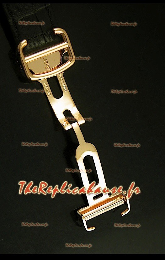 Boîtier arrière fermé avec marquages et gravures Cartier, ainsi que numéro de série gravé comme sur les modèles authentiques.