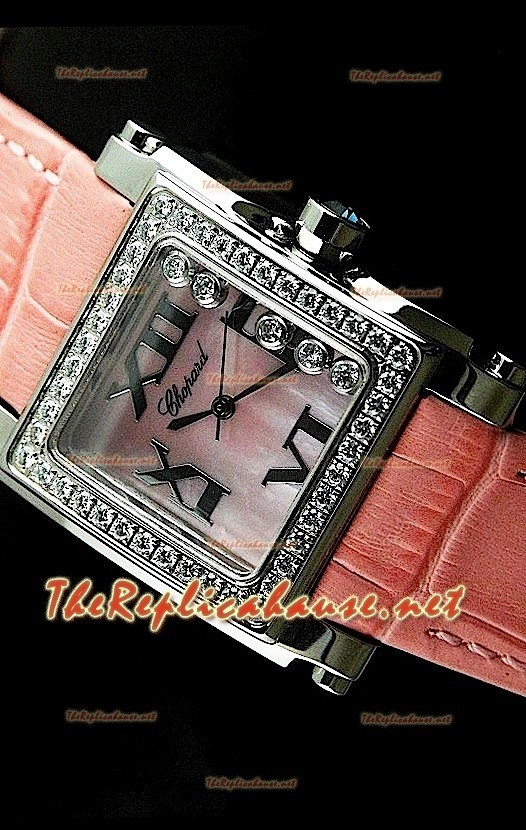 Mère rose de Dial Pearl avec Couper diamants lunette et suisses diamants taillés suisses flottant sur Dial440 Boîtier en acier inoxydable poli Genuine Bracelet en cuir rose avec des marques Chopard et Gravures