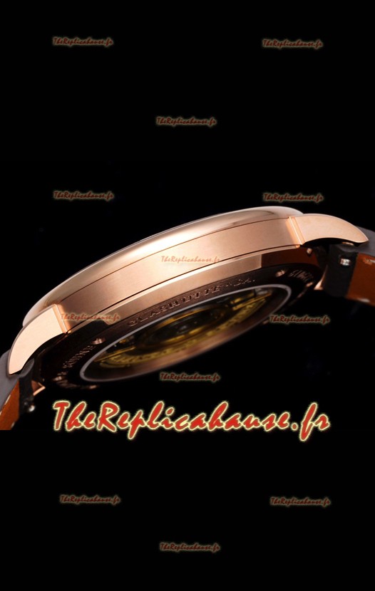 Boîtier en acier inoxydable massif 904 poli plaqué or rose 18 carats, avec fond transparent en acier. Lunette polie.