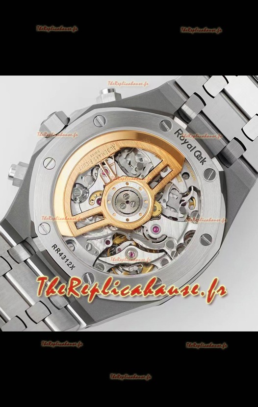 Disposition des machines identique à celle du calibre Audemars Piguet 4401 utilisé dans les montres Audemars Piguet Offshore authentiques. Construit sur l'architecture du mouvement suisse 7753 authentique avec fonction chronomètre fonctionnelle identique à celle de l'original, avec aiguille des secondes sur le sous-cadran à 12 heures.