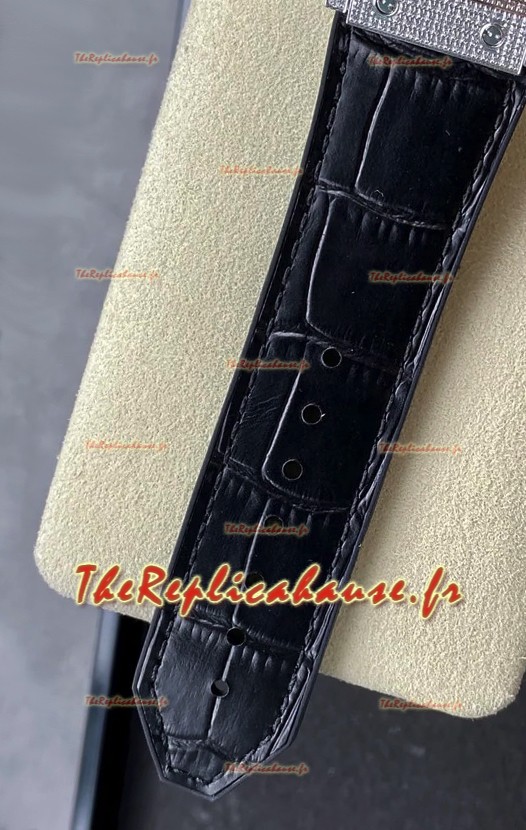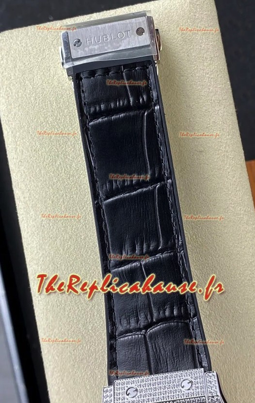 Bracelet en cuir caoutchouté avec boucle déployante en acier, avec marquages et gravures Hublot.