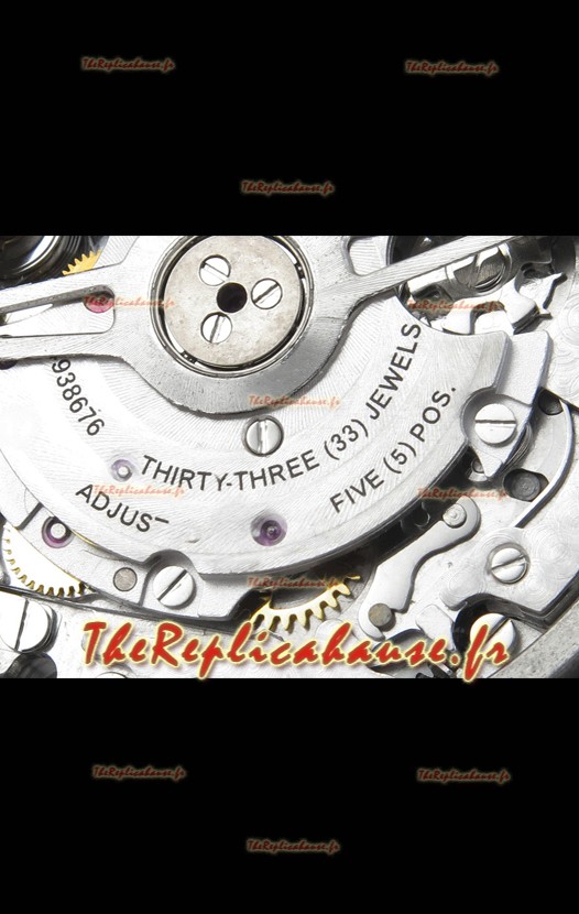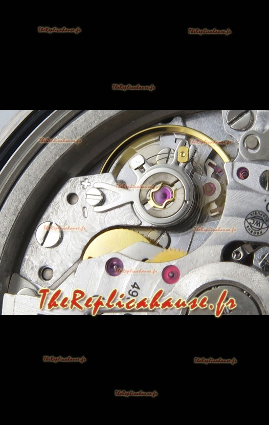 Mouvement 7750 de base modifié pour ressembler au mouvement IWC 69385. Plaque et rotor décorés en platine. Le mécanisme le plus identique par rapport aux modèles originaux.