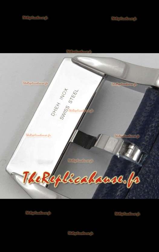 Cadran bleu avec indicateurs blancs. Trois sous-cadrans fonctionnels et fenêtre de date comme sur les modèles originaux.