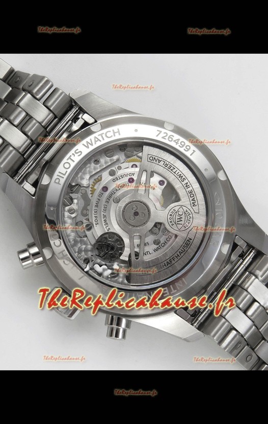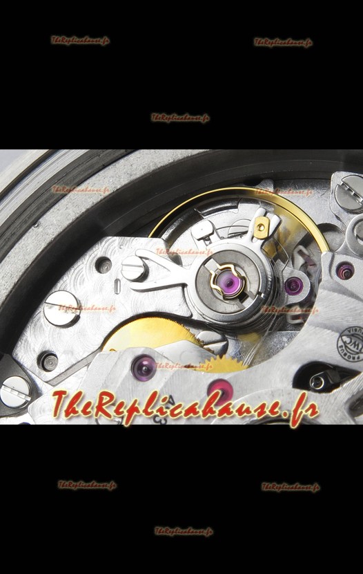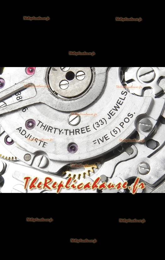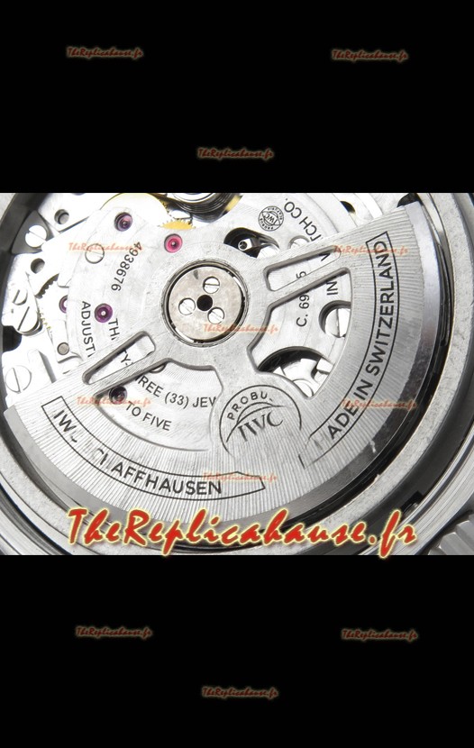 Mouvement 7750 de base modifié pour ressembler au mouvement IWC 69385. Plaque et rotor décorés en platine. Le mécanisme le plus identique comparé aux modèles originaux.