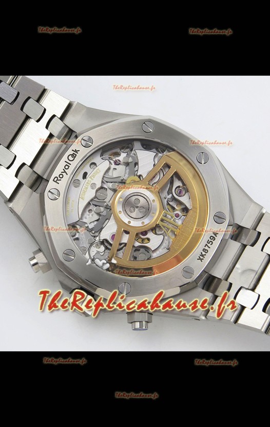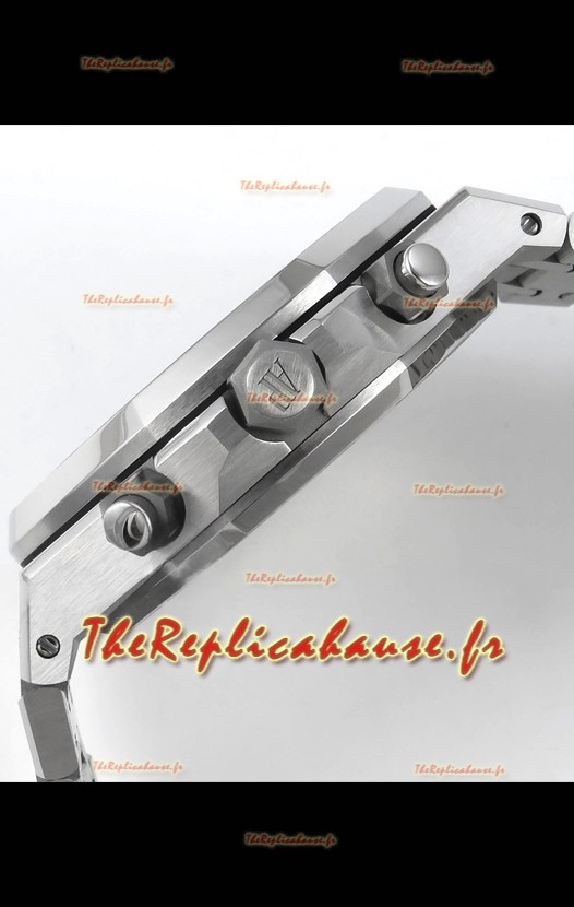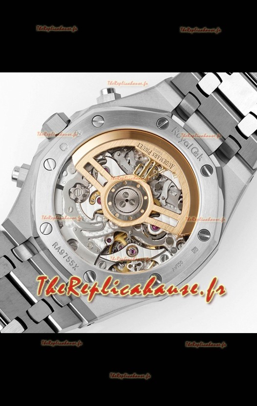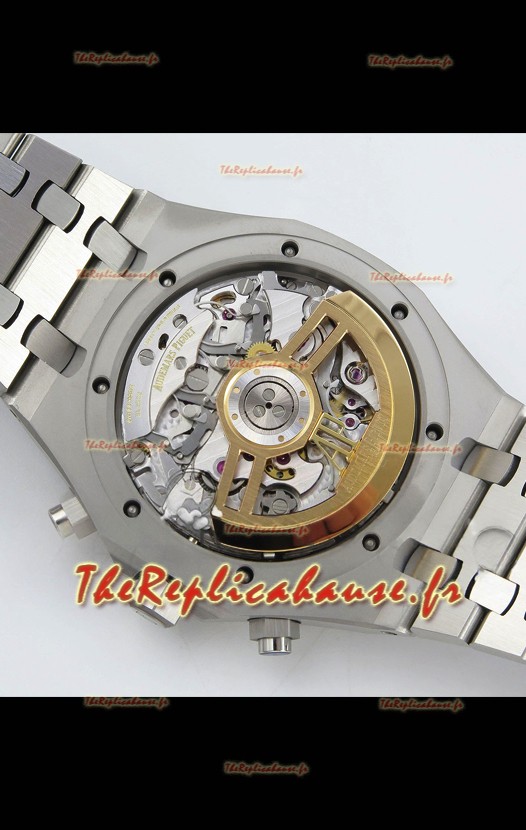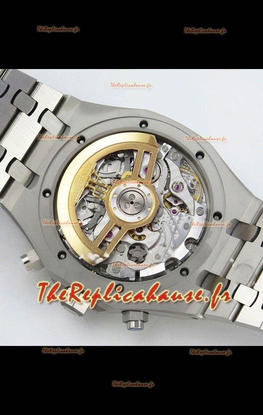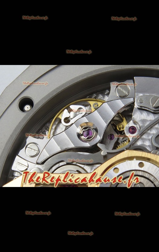 Agencement mécanique identique au calibre 4401 d'Audemars Piguet, utilisé dans les montres Audemars Piguet Offshore authentiques. Basé sur l'architecture du véritable mouvement suisse 7753, il intègre une fonction chronomètre, comme sur le modèle authentique, avec une trotteuse à 12 heures.