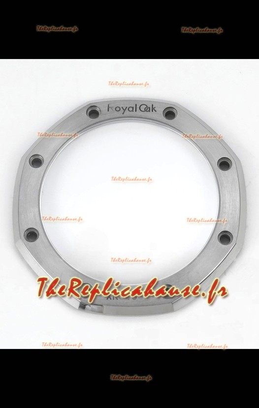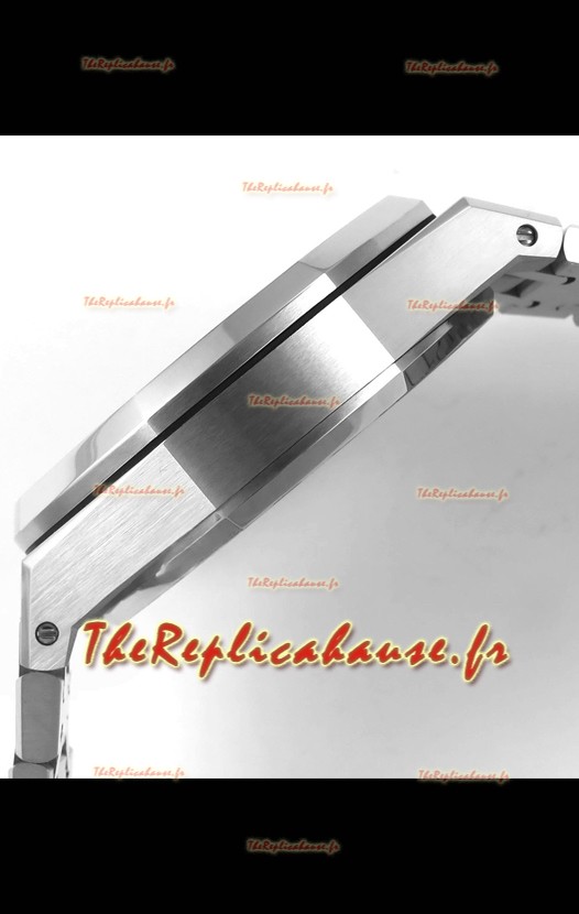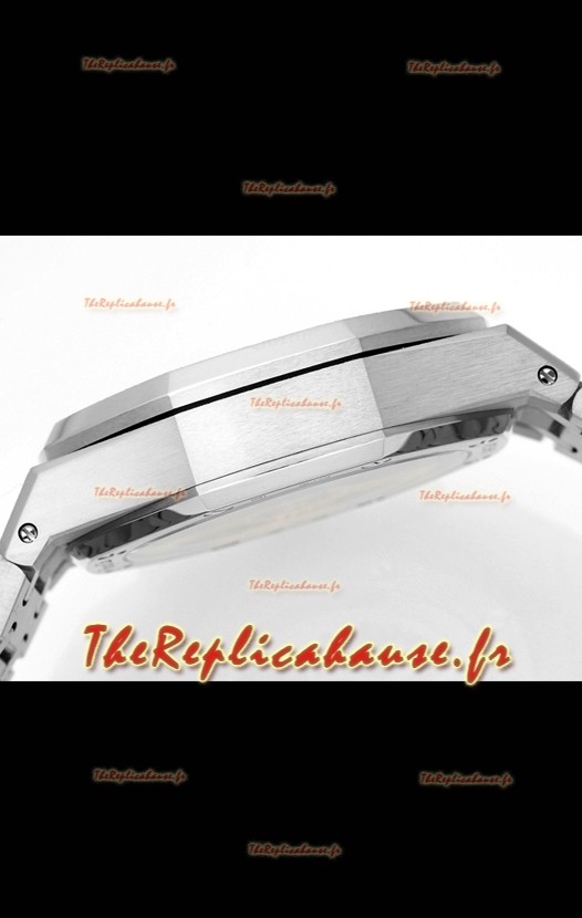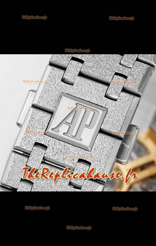 Boîtier en acier 904L plaqué or blanc givré, orné des marquages ​​et gravures AP.