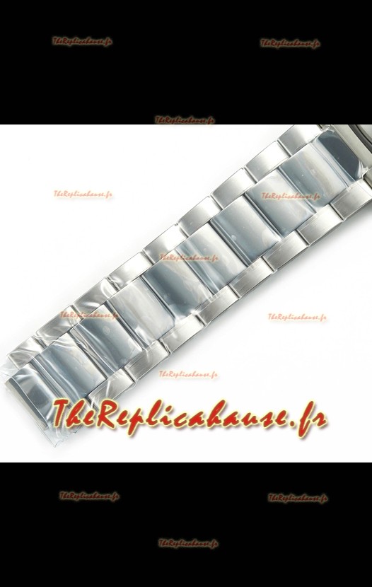 Bracelet en acier inoxydable 904L avec maillons intermédiaires polis et boucle déployante, avec marquages et gravures Omega comme à l'origine.