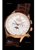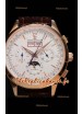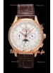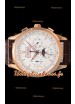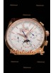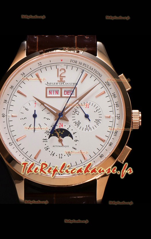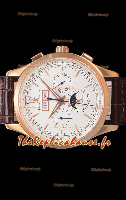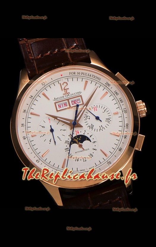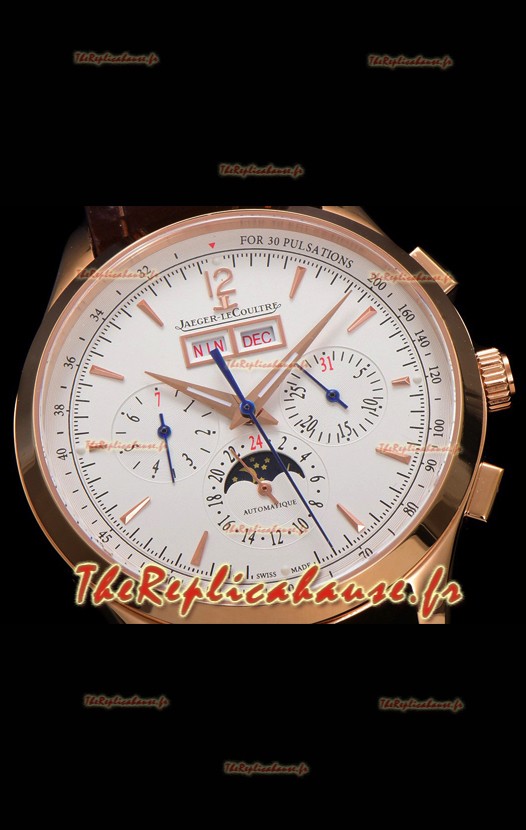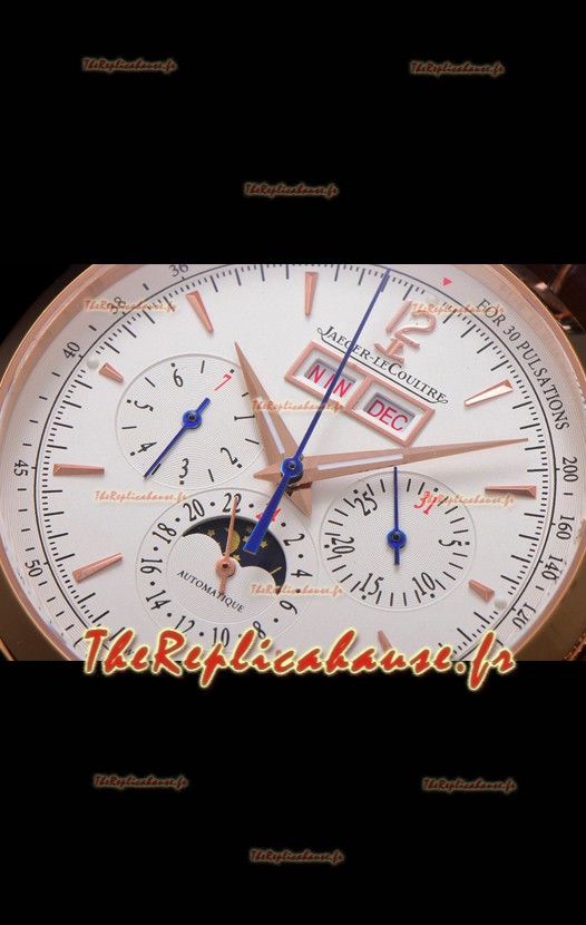 Cadran blanc avec indicateur jour/date à 12 heures, compteur de date, compteur du jour de la semaine et compteur 12/24 heures avec indicateur jour/nuit de phase de lune.