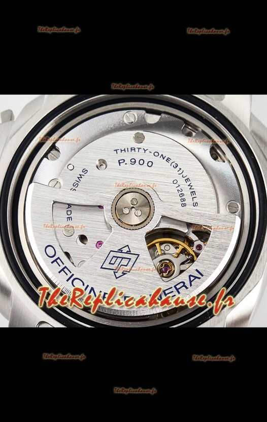 Mouvement suisse 7750 authentique, le meilleur à ce jour. 28 800 vibrations par heure. Plaque de rotor plaquée platine sur le mouvement. Mouvement décoré pour ressembler au mouvement P.9001.