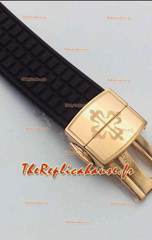 Bracelet en caoutchouc brun avec boucle déployante en acier plaqué or jaune, avec marquage Patek Philippe.