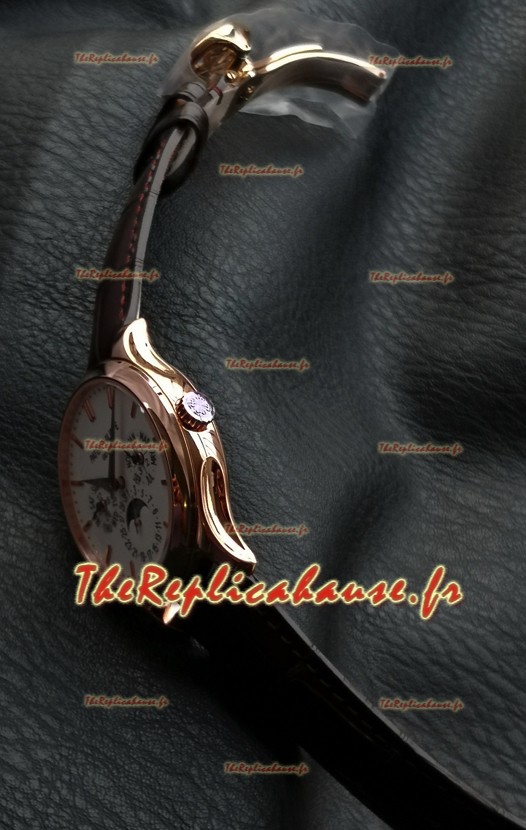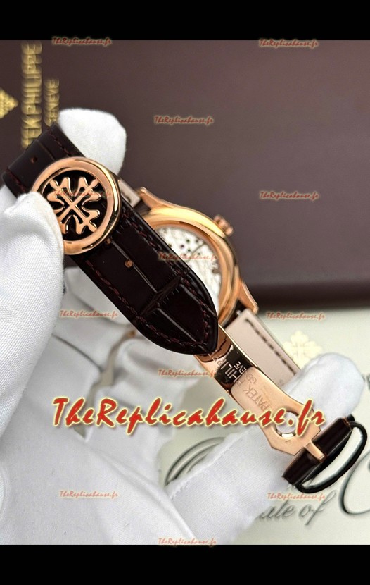 Bracelet en cuir véritable avec boucle déployante plaquée or rose, avec marquage Patek Philippe.