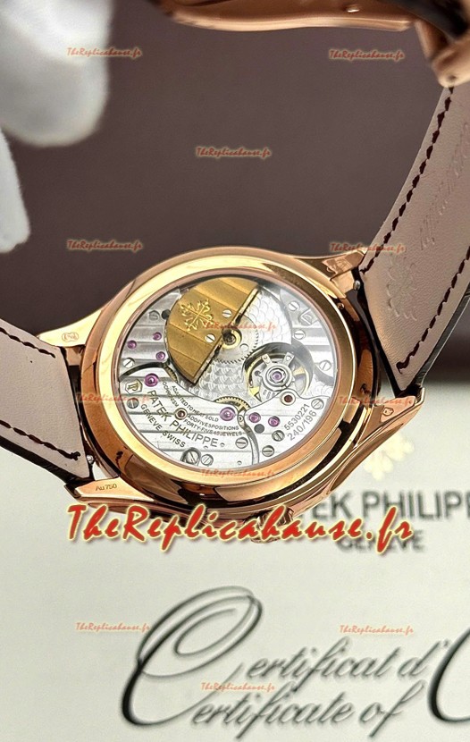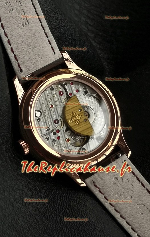 Mouvement suisse 9015 authentique assemblé pour ressembler au mouvement authentique Patek Philippe PP 324 Calibre Style. Rotor, ponts et gravures mis à jour sur le mouvement avec rotor plaqué or rose estampillé Patek Philippe.