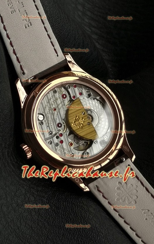 Mouvement suisse 9015 authentique assemblé pour ressembler au mouvement authentique Patek Philippe PP 324 Calibre Style. Rotor, ponts et gravures mis à jour sur le mouvement avec rotor plaqué or rose estampillé Patek Philippe.