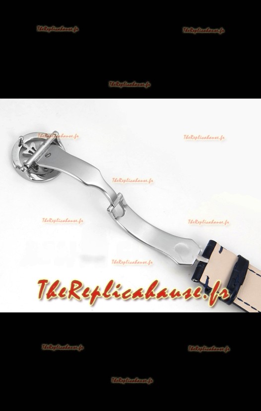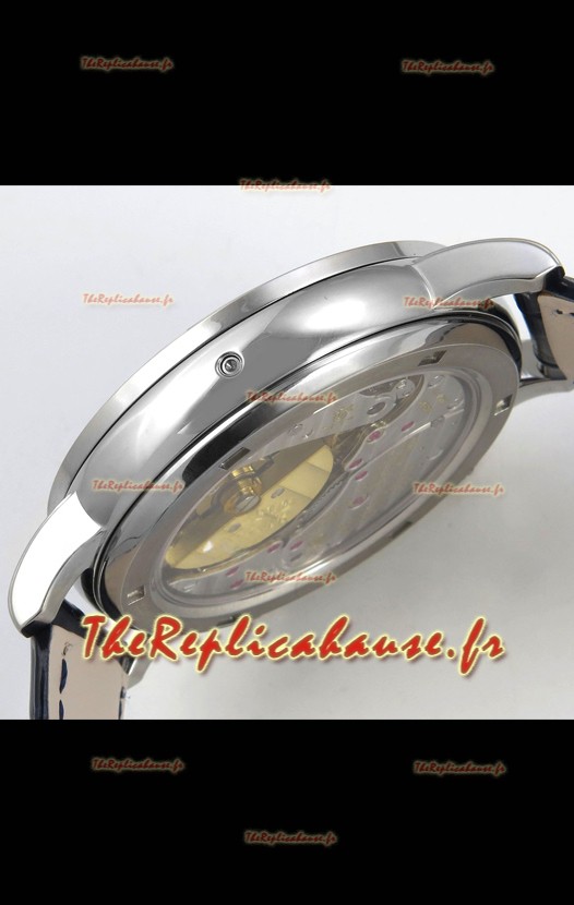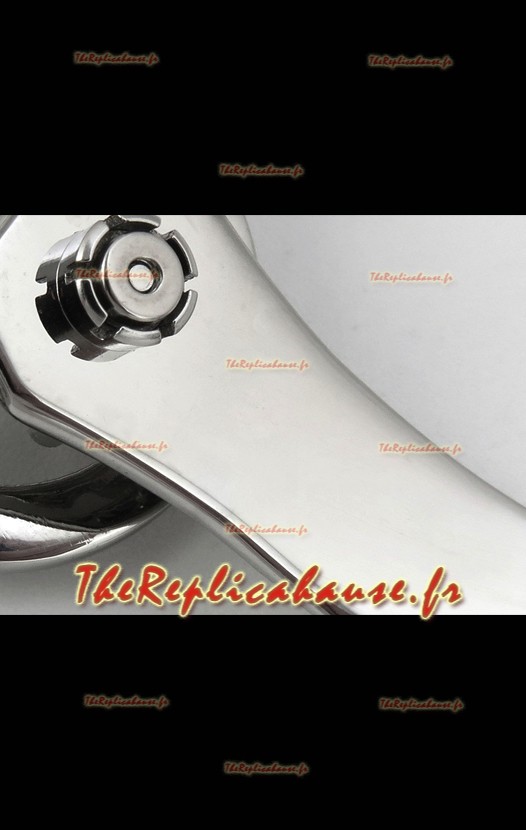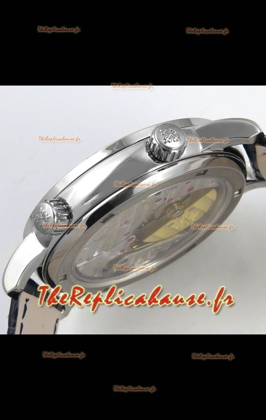 La date se règle à l'aide de la couronne à 2 heures, la phase de lune se règle à l'aide de la couronne à 4 heures (la phase de lune est un indicateur nuit/jour et non la phase de lune réelle que l'on trouve dans les montres Patek Philippe 6120P originales).