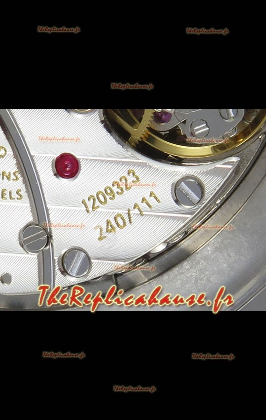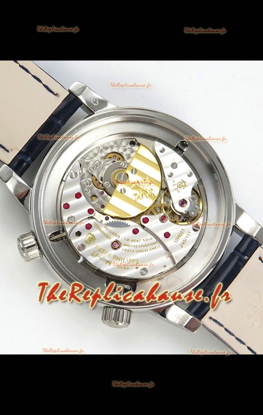 Mouvement suisse 9015 authentique assemblé pour ressembler au mouvement authentique Patek Philippe PP 240 Calibre Style. Rotor, ponts et gravures mis à jour sur le mouvement avec rotor plaqué or rose estampillé Patek Philippe.