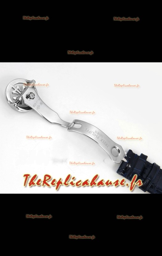 Bracelet en cuir véritable avec boucle déployante en acier, complet avec les marquages Patek Philippe.