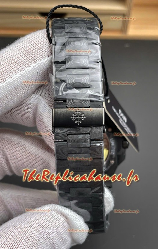Bracelet en fibre de carbone relié par des broches comme les originaux, avec boucles Patek Philippe signées comme les originaux.