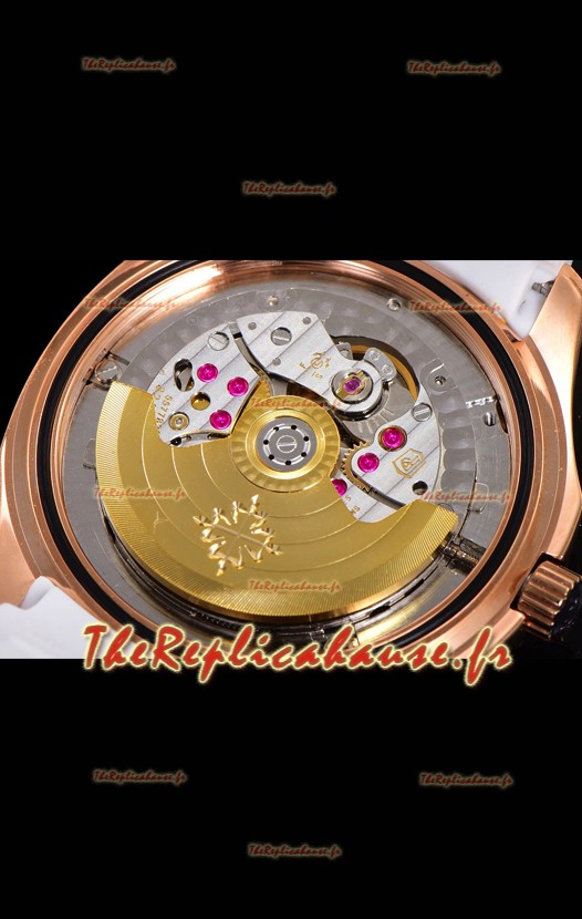 Mouvement suisse 9015 authentique assemblé pour ressembler au mouvement authentique Patek Philippe PP 324SC Calibre Style. Rotor, ponts et gravures mis à jour sur le mouvement.