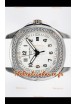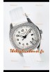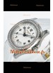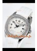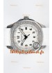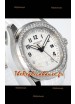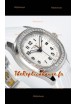 Cadran blanc texturé avec indicateur de date. Lunette sertie de diamants taillés en Suisse.