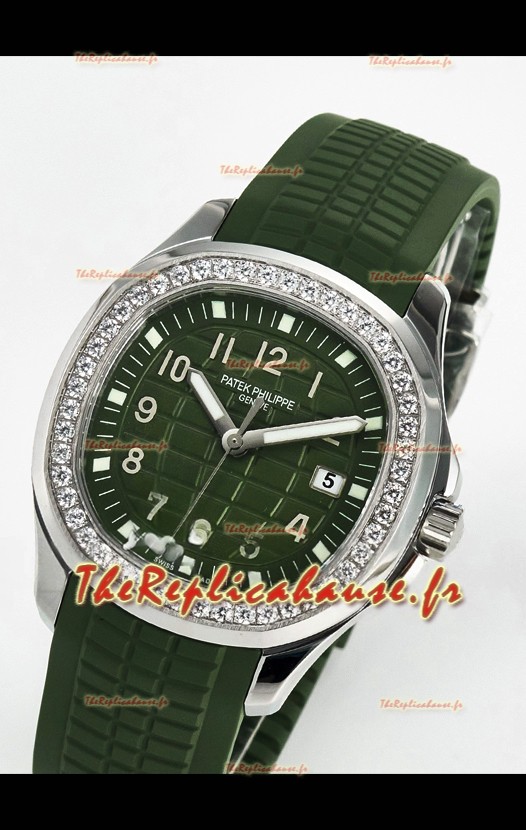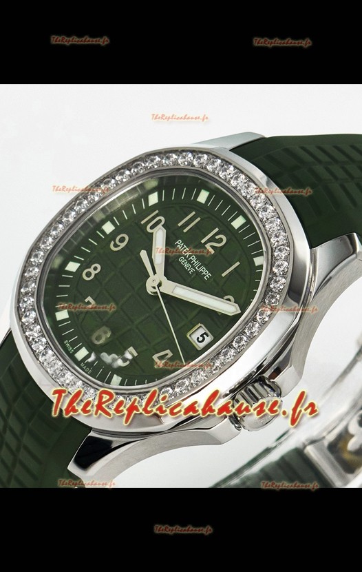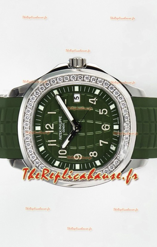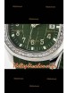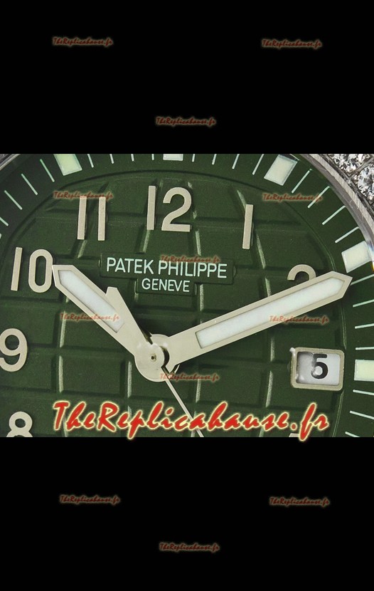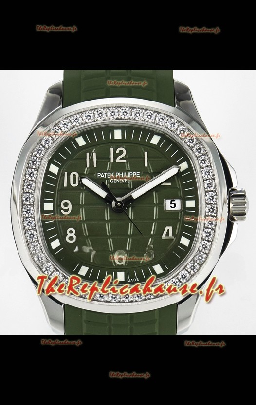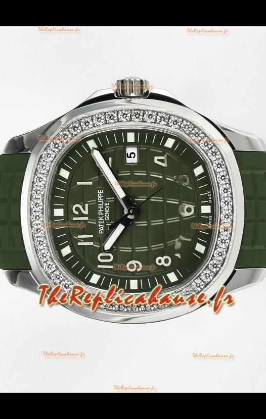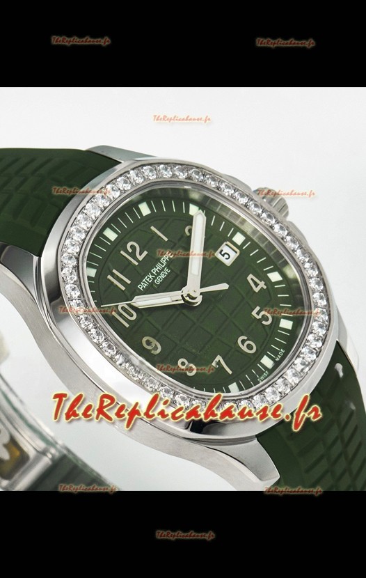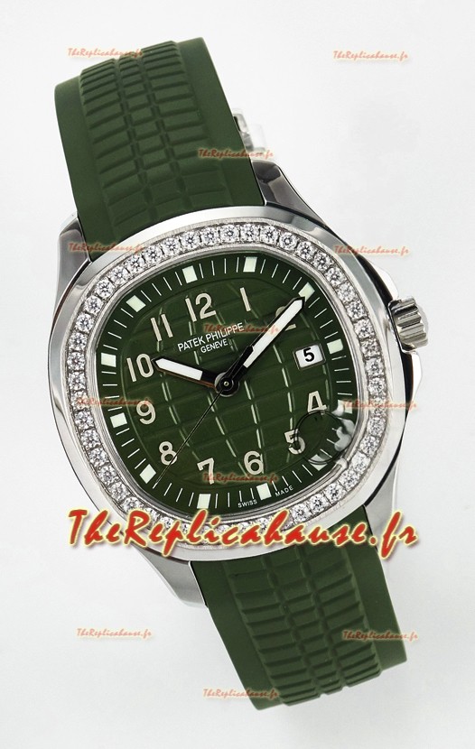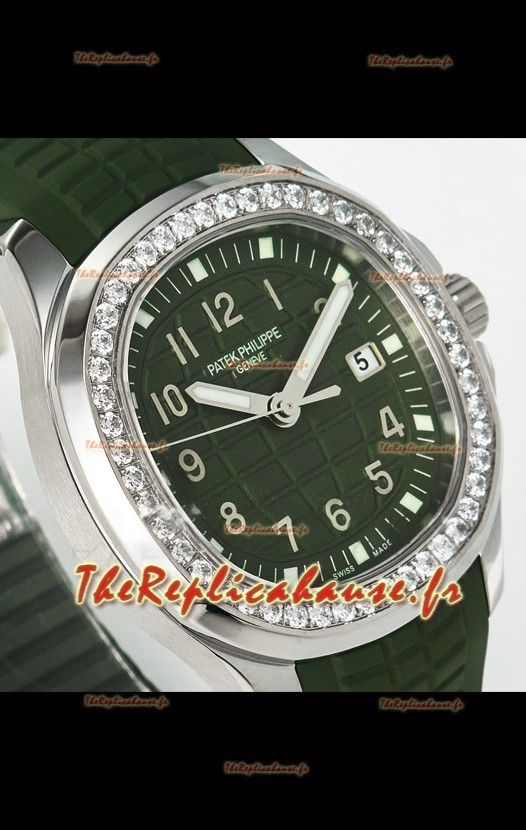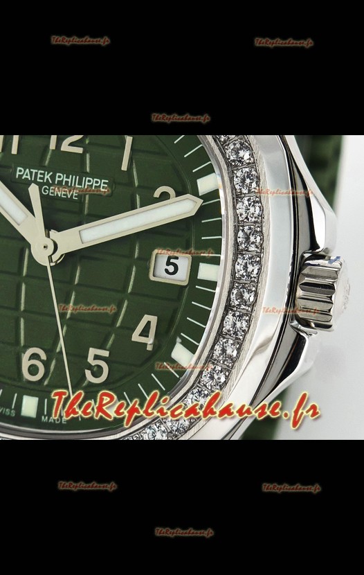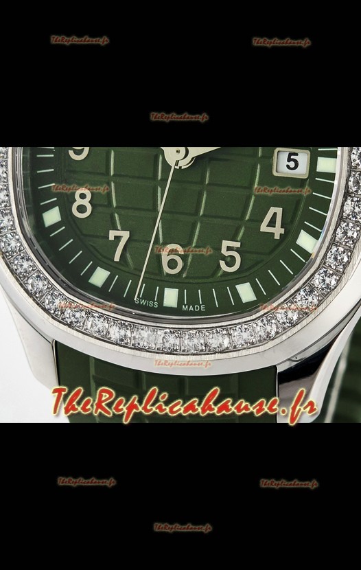 Cadran vert texturé avec indicateur de date. Lunette sertie de diamants taillés à la suisse.