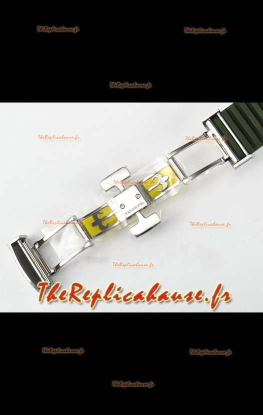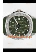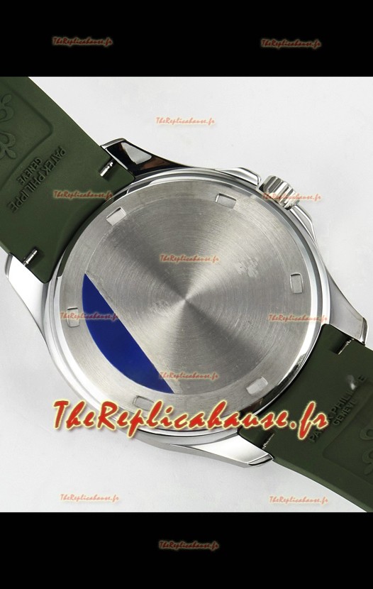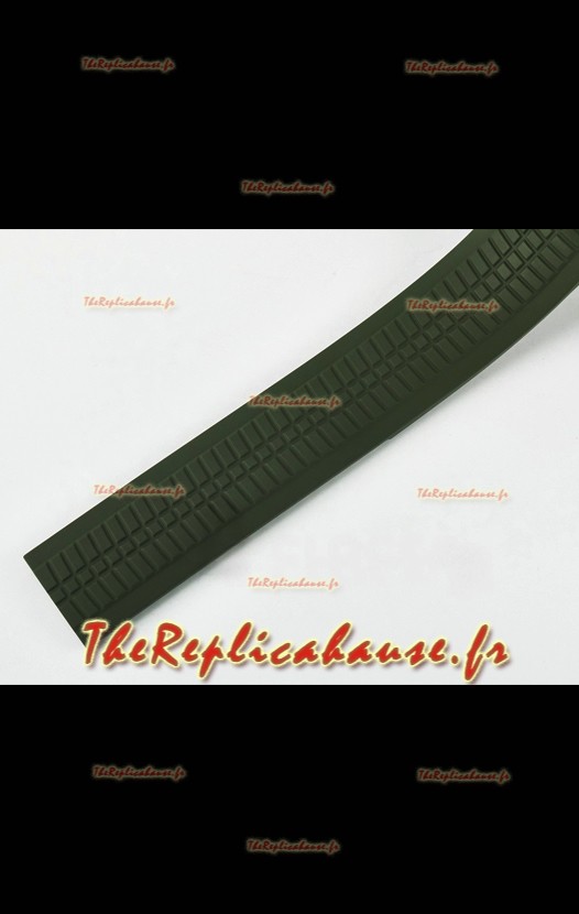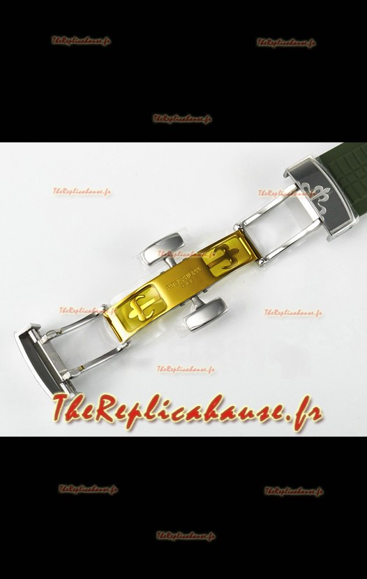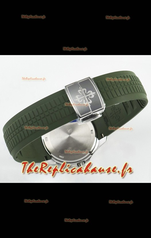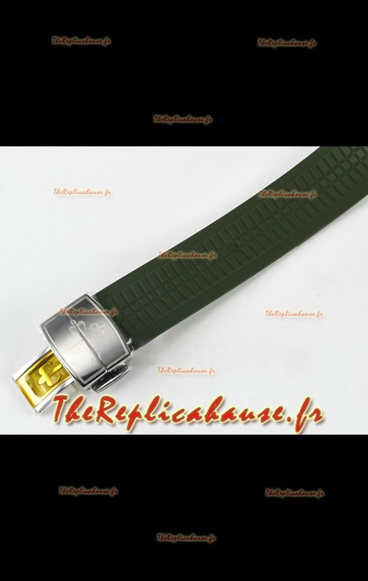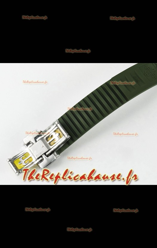 Bracelet en caoutchouc vert incurvé avec boucle déployante en acier, complet avec les marquages Patek Philippe. Une boucle hautement améliorée pour cette série, avec des marquages/gravures beaucoup plus précis.