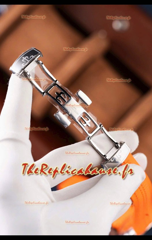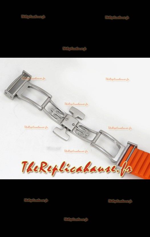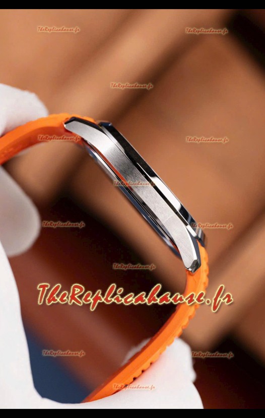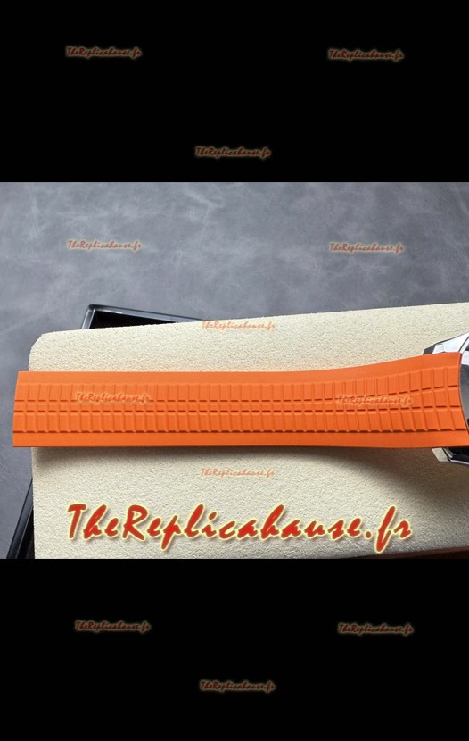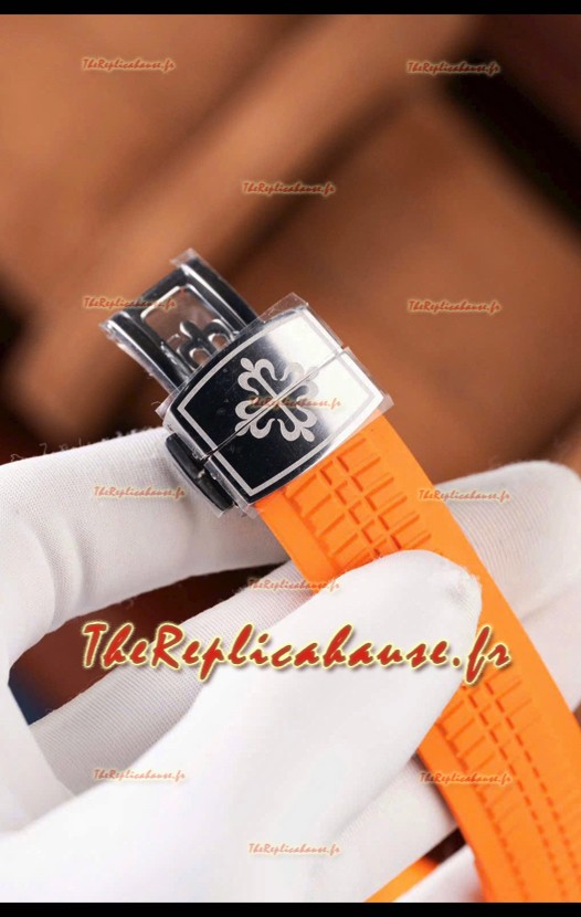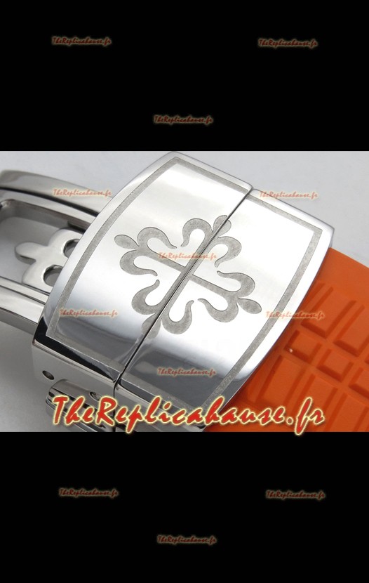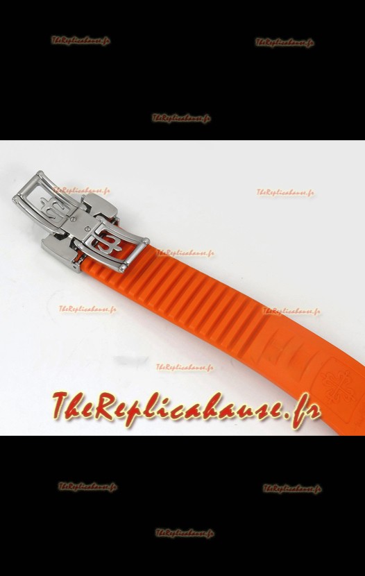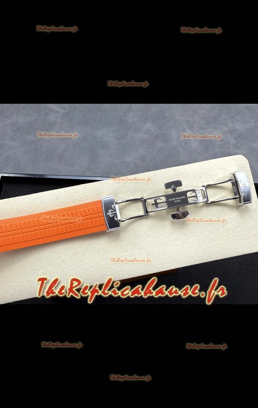Bracelet en caoutchouc incurvé avec boucle déployante en acier et marquage Patek Philippe. Boucle largement améliorée pour cette série, avec des marquages/gravures beaucoup plus précis.