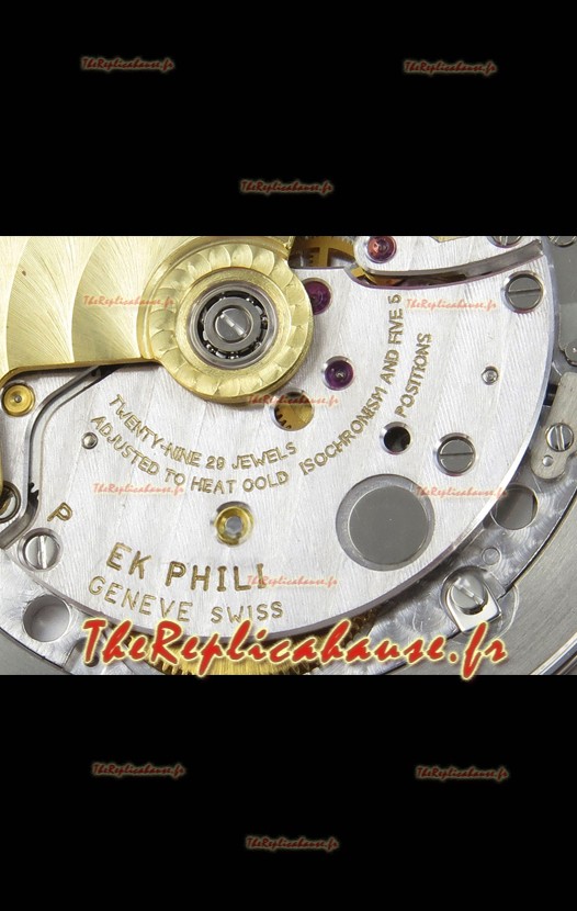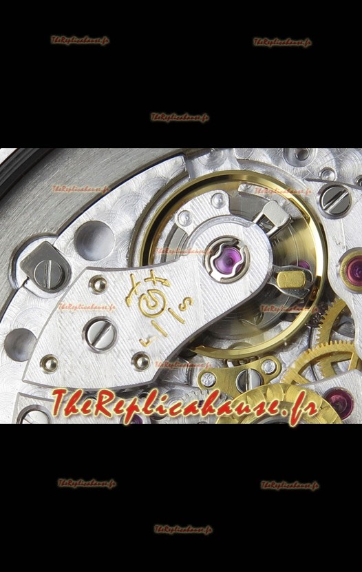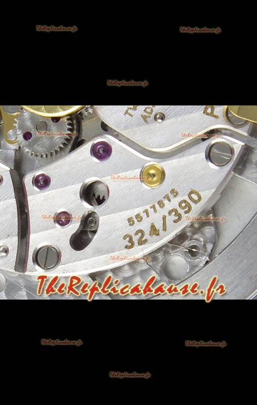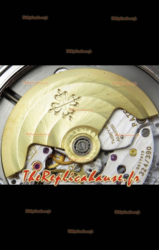 Mouvement suisse 9015 authentique assemblé pour ressembler au mouvement authentique Patek Philippe PP 324 CS Calibre Style. Rotor, ponts et gravures mis à jour sur le mouvement.