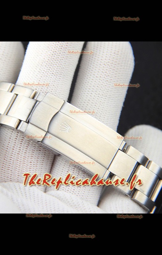 Bracelet en acier inoxydable 904L avec fermoirs Rolex et marquages/gravures Rolex.
