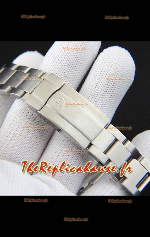 Bracelet en acier inoxydable 904L avec fermoirs Rolex et marquages/gravures Rolex.