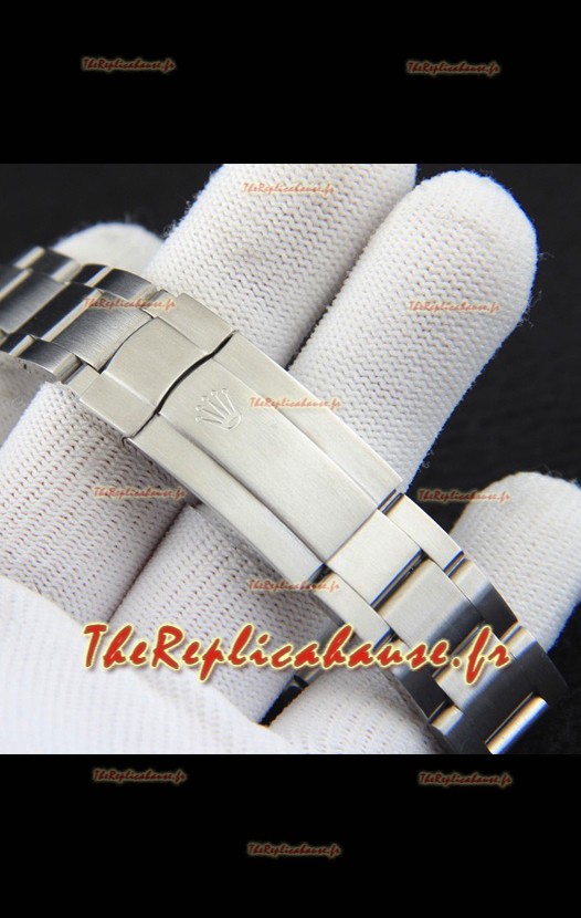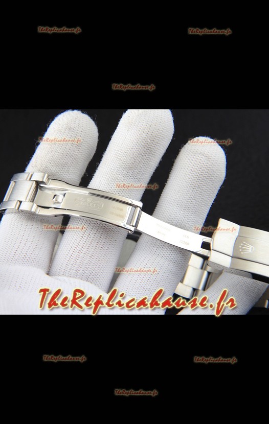 Bracelet en acier inoxydable 904L avec fermoirs Rolex et marquages/gravures Rolex.