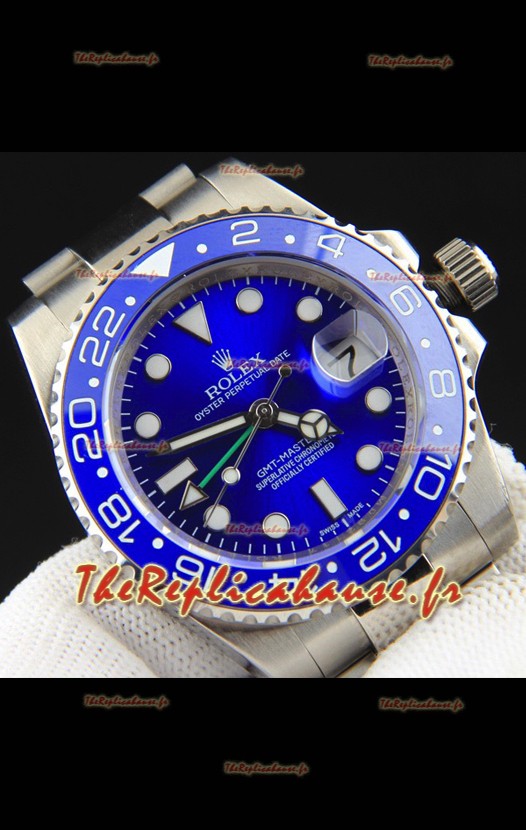 Réplique de montre Rolex GMT Master II à mouvement japonais, boîtier en acier, cadran bleu