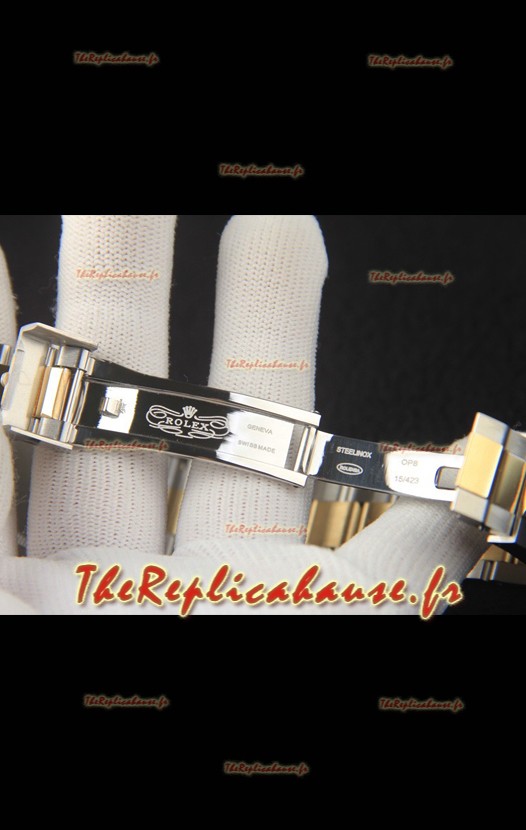 Plaqué or jaune 18 carats bicolore sur bracelet en acier inoxydable 904L avec boucle Rolex et gravures Rolex.