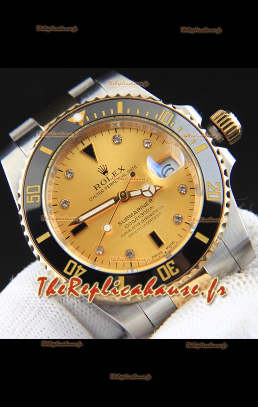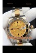 Réplique japonaise de la montre Rolex Submariner, boîtier bicolore en or jaune et cadran en or.