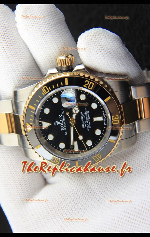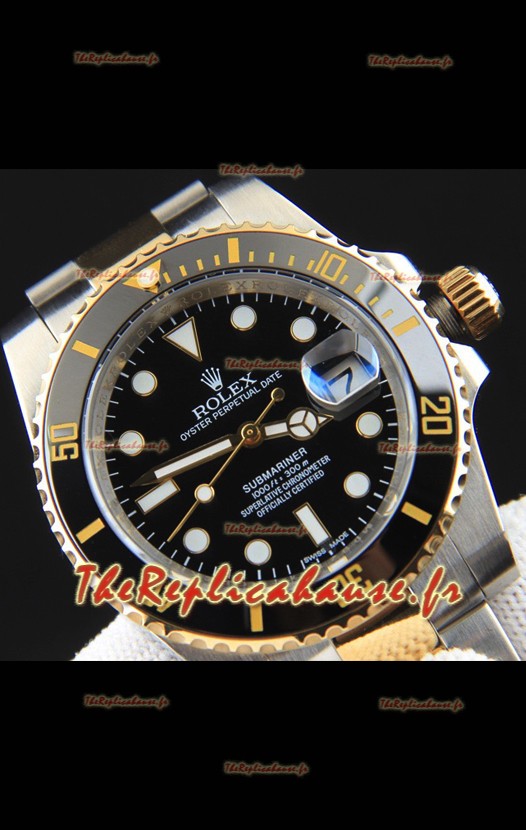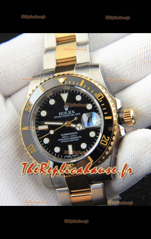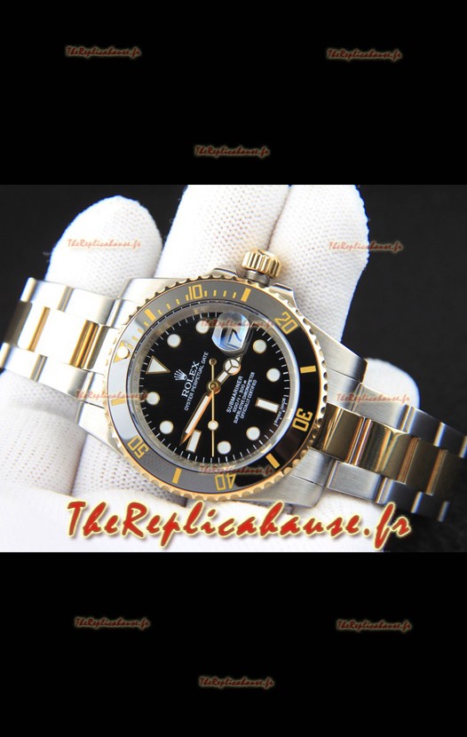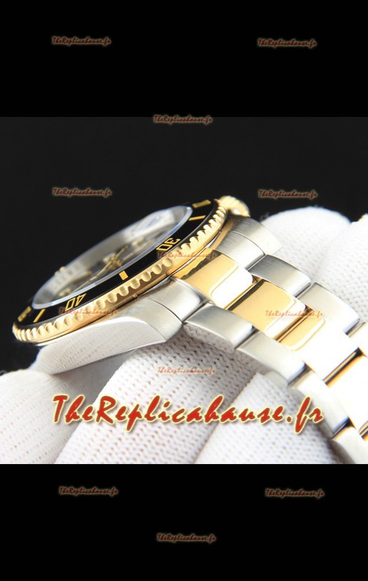 Réplique japonaise de la montre Rolex Submariner, boîtier bicolore or jaune et cadran noir.