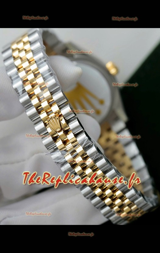 Bracelet bicolore en acier inoxydable 904L plaqué or jaune 18 carats avec boucle déployante Rolesor de nouvelle génération. Les maillons de bout s’alignent parfaitement avec le boîtier. – Une version Datejust nettement améliorée.