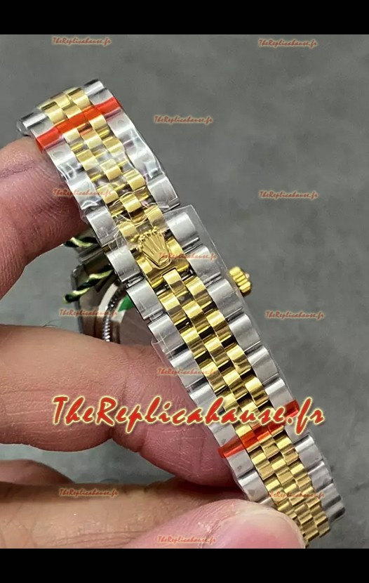 Bracelet Datejust bicolore plaqué or jaune 18 carats sur acier inoxydable 904L avec boucle déployante. Les maillons de bout s'alignent parfaitement avec le boîtier. - Version améliorée du bracelet Datejust.