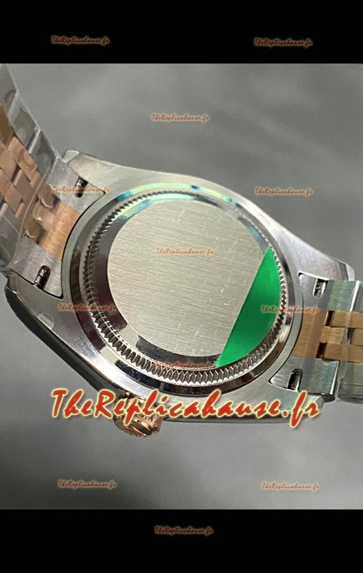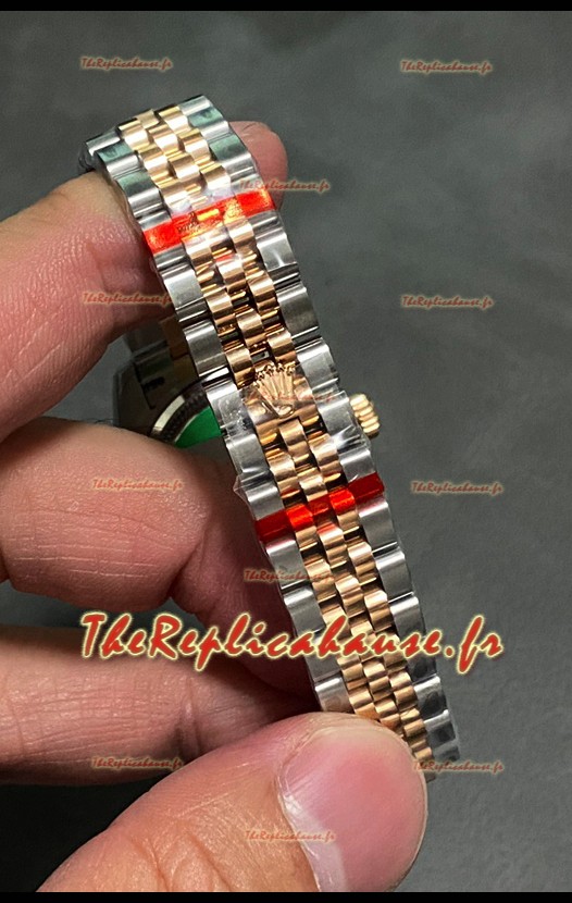 Bracelet bicolore en acier inoxydable 904L plaqué or rose 18 carats avec boucle déployante. Les maillons de bout sont parfaitement alignés avec le boîtier. - Une version améliorée du bracelet Datejust