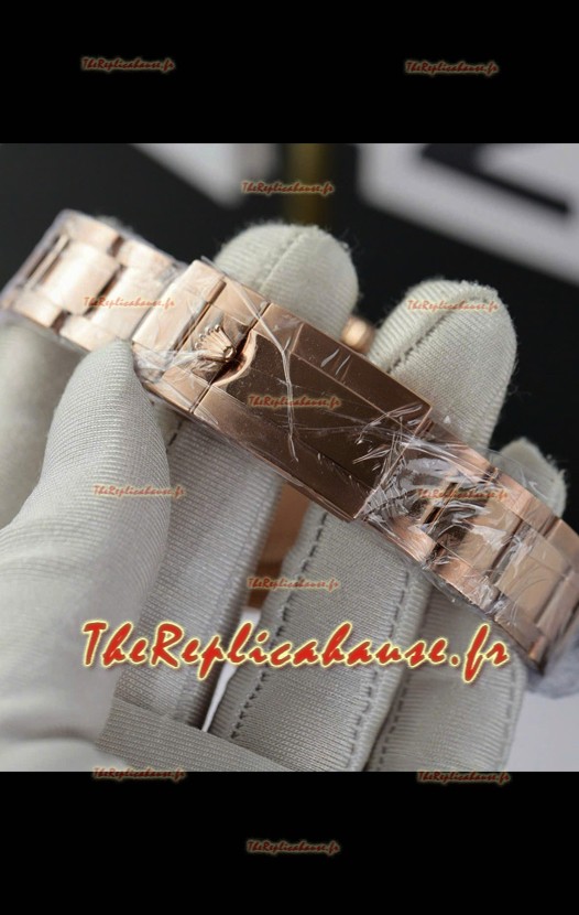 Couronne vissée monobloc avec joint torique en caoutchouc et tube de couronne épais, identique à celui de l'original. Bracelet en acier inoxydable 904L plaqué or rose, assemblé par vis ; il s'agit du meilleur bracelet jamais conçu pour la série GMT, avec fermoirs à boucle déployante et marquages Rolex. Barres de ressort de 2 mm à tête arrondie, identiques à celles des bracelets GMT d'origine.