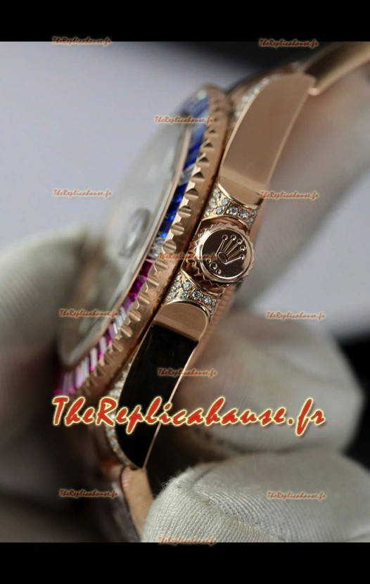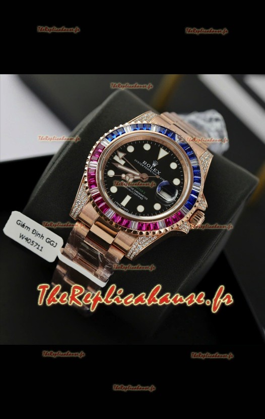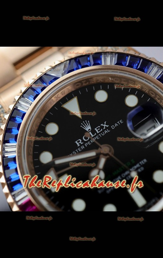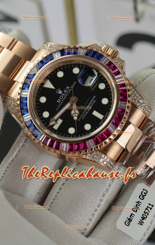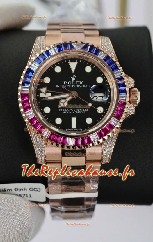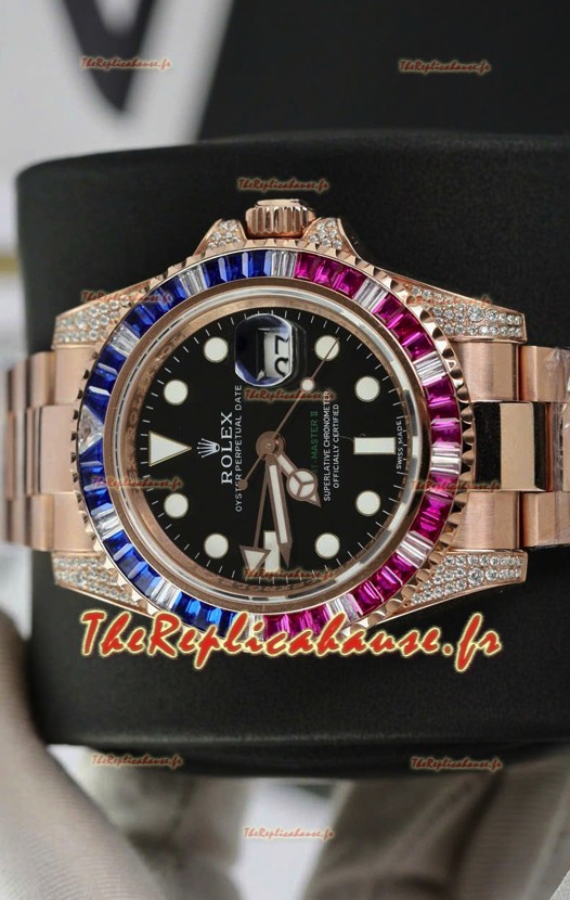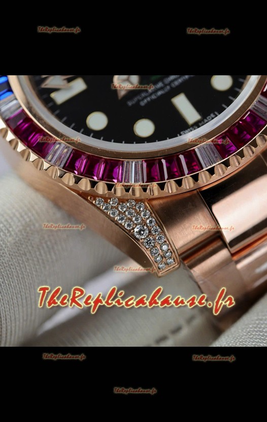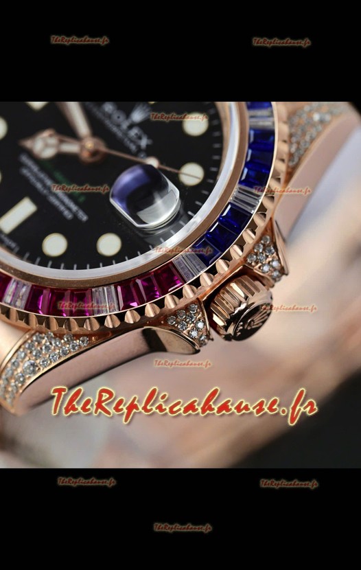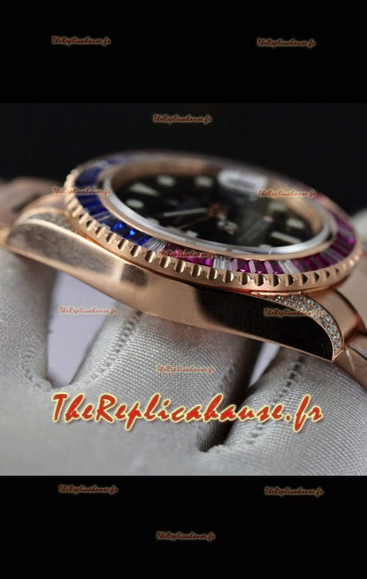 Montre Rolex GMT Master Super Clone sertie de diamants, boîtier en or rose 904L - Qualité miroir 1:1