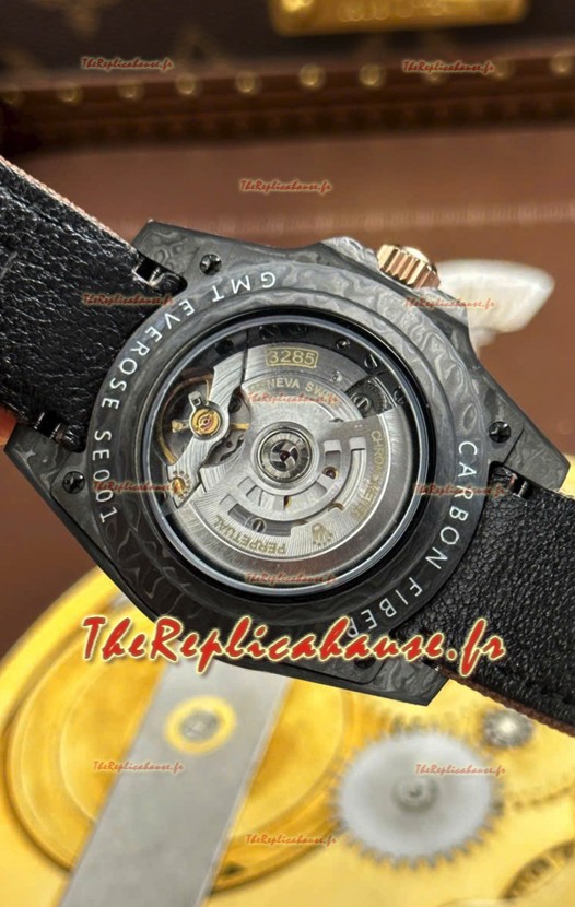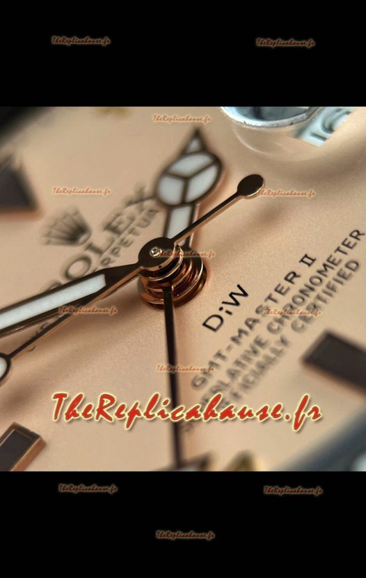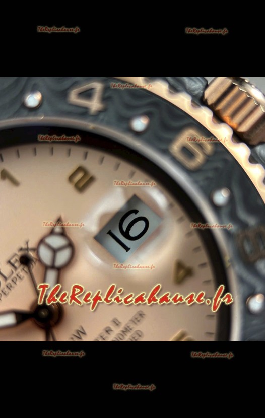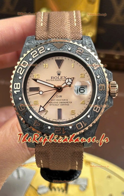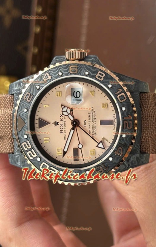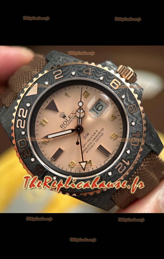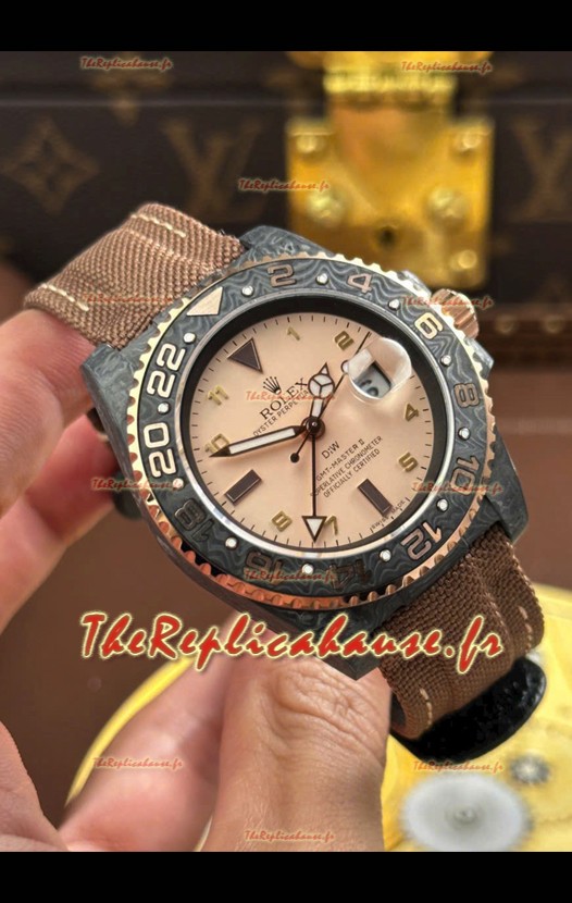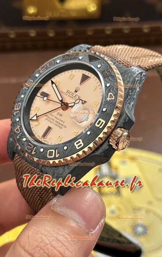 Rolex GMT Master DiW, réplique suisse, boîtier en carbone noir, cadran beige-gris.