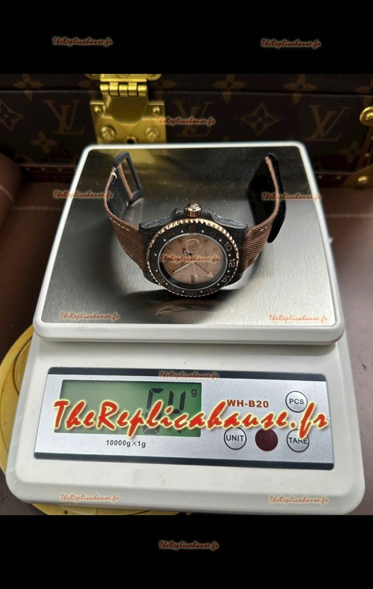 You're reviewing: Rolex GMT Master DiW, réplique suisse, boîtier en carbone noir, cadran beige-gris.