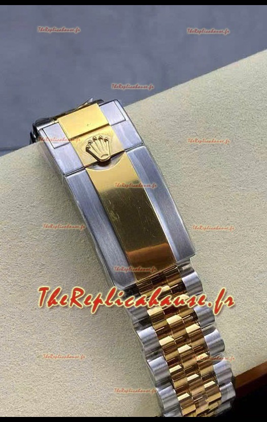 Plaqué or jaune bicolore. Bracelet en acier inoxydable 916L à maillons vissés, le meilleur bracelet jamais conçu pour la série GMT, avec fermoirs à boucle déployante et marquages Rolex. Barres de ressort d'entre-corne de 2 mm à tête arrondie, identiques à celles des bracelets GMT d'origine. Dimensions :