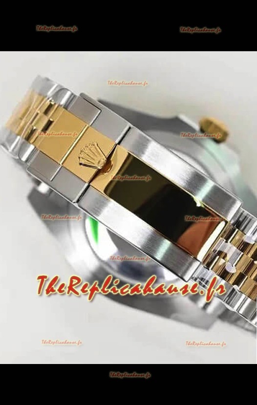 Placage or jaune bicolore. sur bracelet en acier inoxydable 916L relié par des vis, le meilleur bracelet fabriqué à ce jour pour la série GMT avec fermoirs de style Flip Lock complets avec marquages et gravures Rolex. Barres à ressort de 2 mml avec têtes arrondies exactement comme les bracelets de montre GMT originaux.