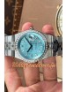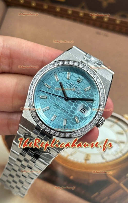 Cadran bleu glacier à motif nid d'abeille avec guichet de date. Lunette sertie de diamants.