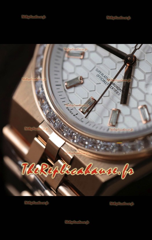 Cadran nid d'abeille en acier avec guichet de date. Lunette sertie de diamants.