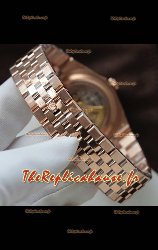 Bracelet en acier inoxydable 904L plaqué or rose 18 carats avec boucle déployante. Les maillons de bout sont parfaitement alignés avec le boîtier. - Une version améliorée du bracelet Datejust