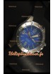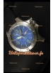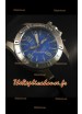 Cadran bleu avec fenêtre pour date et jour et lume verte sur les indicateurs et les aiguilles des heures avec lume bleue sur les index Diver