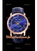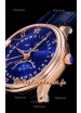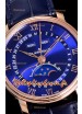 Cadran bleu avec chiffres romains des heures, indicateur fonctionnel de phase de lune pour la fonction 12/24 heures et indicateur fonctionnel de date avec aiguilles en zigzag comme sur les originaux. Indicateur fonctionnel du jour et du mois