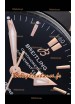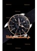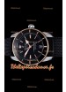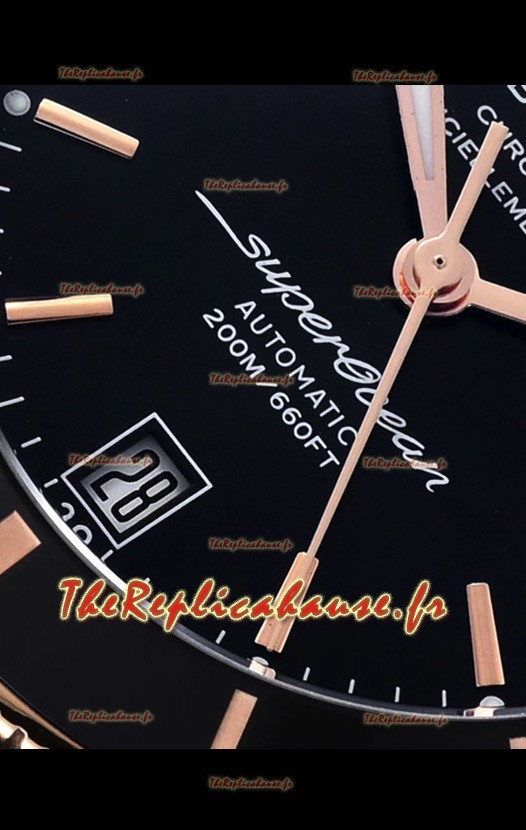 Cadran noir avec chiffres des heures en bâton, index des heures et indicateur de date avec marquages nets et précis sur le cadran.