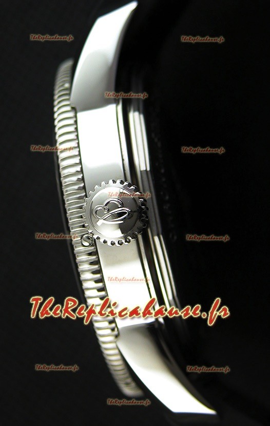 Cadran noir avec index numérique en bâtonnet et indicateur de date avec repères précis et nets sur le cadran